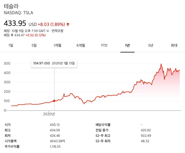테슬라는 시가총액 약 453조로 세계 14위 기업이다.