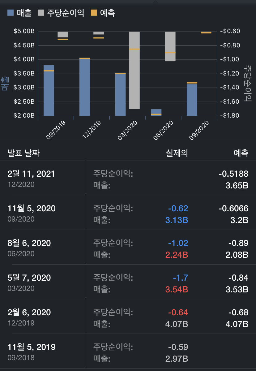 실적은 매년 마이너스고 근래엔 자율주행시스템사업까지 포기했지만 그래도 우버의 전망은 너무 좋다. 연관사업들도 너무 유망하고 이에 투자하는 기업들도 무수히 많고 금액도 엄청나다. 이로 매년 수천억에 달하는 적자를 버티고 있는 상황이다. 국내엔 쿠팡, 해외는 우버다.