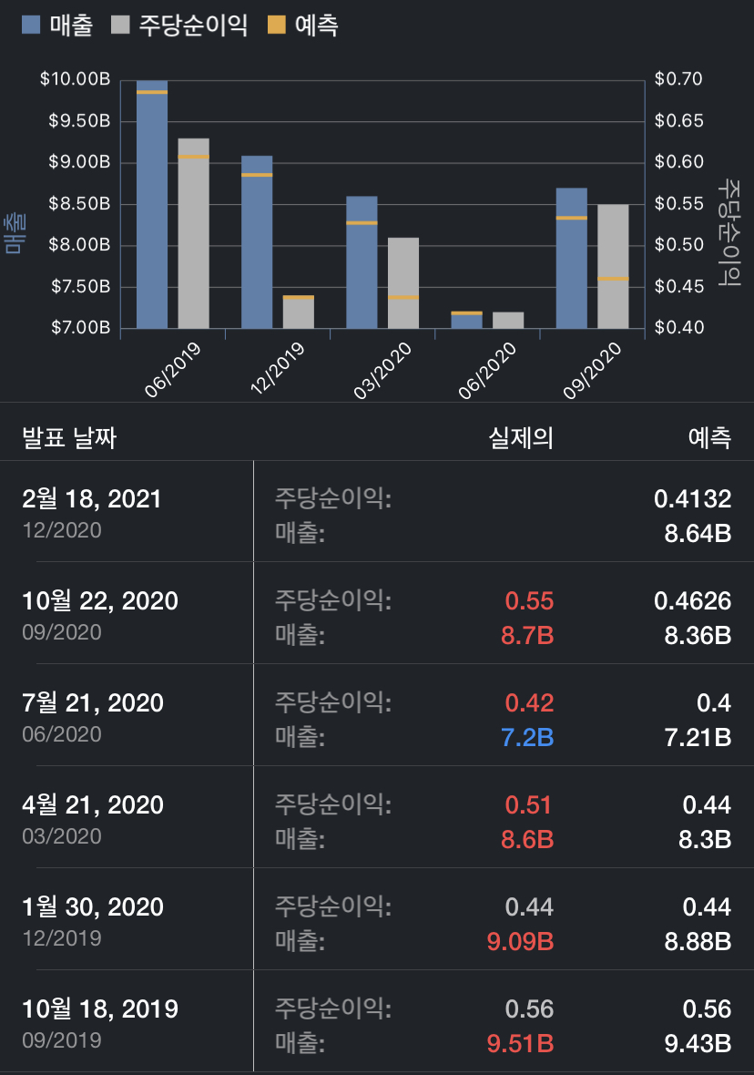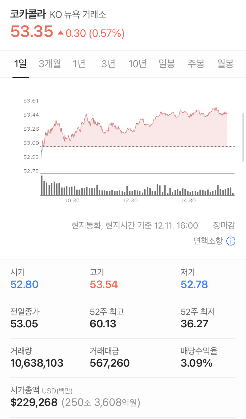 코카콜라는 워렌버핏이 최대 주주로 있으며 시가총액 250조의 세계 30~40위권의 기업이다. 또 배당주로 유명하다. 매년 4, 7, 10, 12월에 배당금이 입금되고 이번 10월 기준으로 시가 배당률은 약 3.3%정도다. 코카콜라는 IT나 바이오의 주가처럼 크게 휘청거리지 않고 꼬박꼬박 배당금을 주는 은행 같은 주식이였는데 근래 코로나19사태로 인해 현재 50달러에 육박하던 코카콜라가 36달러까지 떨어졌었는데 천재일우의 기회를 놓쳤다. 코카콜라의 주가는 언제그랬냐는듯이 소폭씩 상승해 현재 1주당 53달러 정도에 거래되고있다.